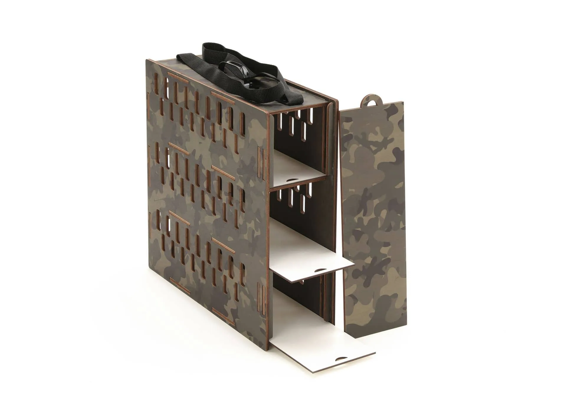 Finitura camouflage con tracolla e maniglia per il trasporto.
